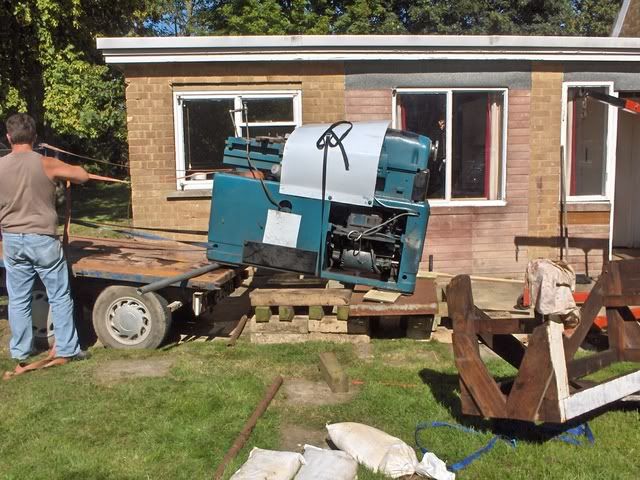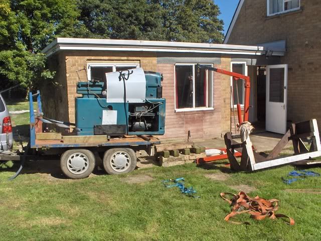 well this wasnt a lot of fun ,it weighs 2300 lbs according to the net ,and it is now on the ground and no one got crushed ..... it was touch and go for a while ....now got to get the mill off the same trailer tomorrow ...eeek