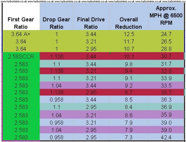 I know this has come up alot recently so I did a quick spread sheet to have alook at it. I've laid out below the overall reduction and approx. speed in first gear for various set ups. the first 3 lines are for a standard A+ set up and the lines after that are for the minispares clubman set 1st gear for some of the various combinations of avalible drop gear ratios and final drives
