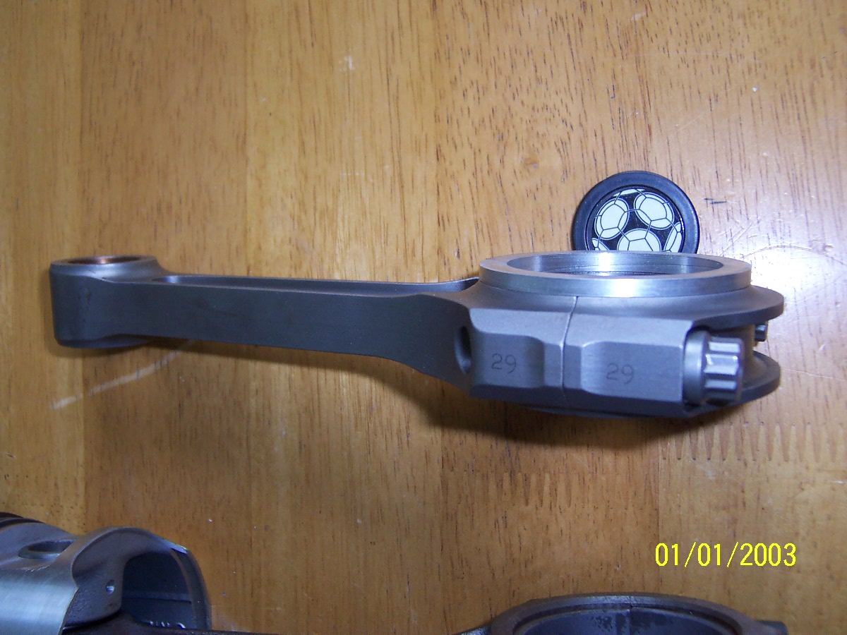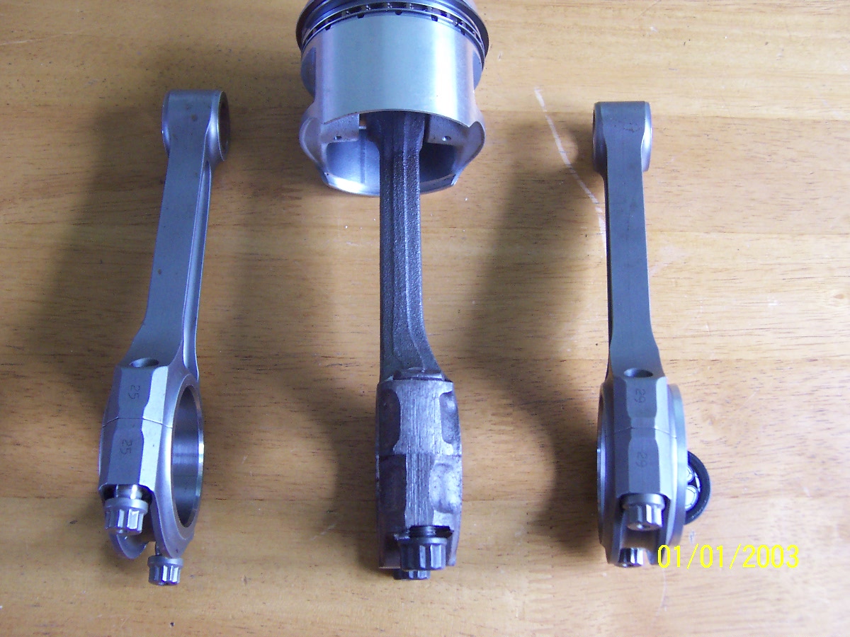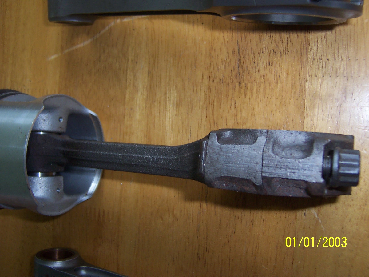 Here are a few pics of my Ebay rods. As you can see from the pics they are symmetrical and at first glance they appear to be a non starter. What I plan to do is to use an ally spacer on one side of the big end to give the required offset at the crank end. These will be fixed to the rod and cap with 3 off 2mm Csk set screws. The little end should be OK with just one side machined down by 1mm. It will mean that the rod shank is running offset to the piston centre line by 1.5 - 2.0mm (Do you think this may be a problem) The rods are bushed and the pistons I am using are Omegas which have large flats on either side. will PTFE buttons be OK to locate the pins or should I put circlip grooves in the piston? Would a press fit pin be OK if the bush is left in place as an alternative? How much side clearance between rod little end and piston boss is advisable to allow for crank flex? I think any input on these questions could prove very useful if alternative rods are to be found and used. These rods are german made and were bought from ebay for £30 +p&p. No sizes were given and as i work on a few different motors I took a flyer and bought them. They turned out to be spot on for length, 004" under on big end dia & 012" under on little end dia. Lucky or what! I contacted the manufacturer to find out there original application but unfortunatly they turned out to be arrogant and totally un cooperative. I did a little research at the time and the closest match came from a BMW car engine.(cant remember which). Regards Dave Would aluminium be a suitable material for the spacer ? What about Tig-ing a suitable piece of steel to the side of the rod cap ? Although I guess that might muck up the balance more... 9.85 @ 145mph