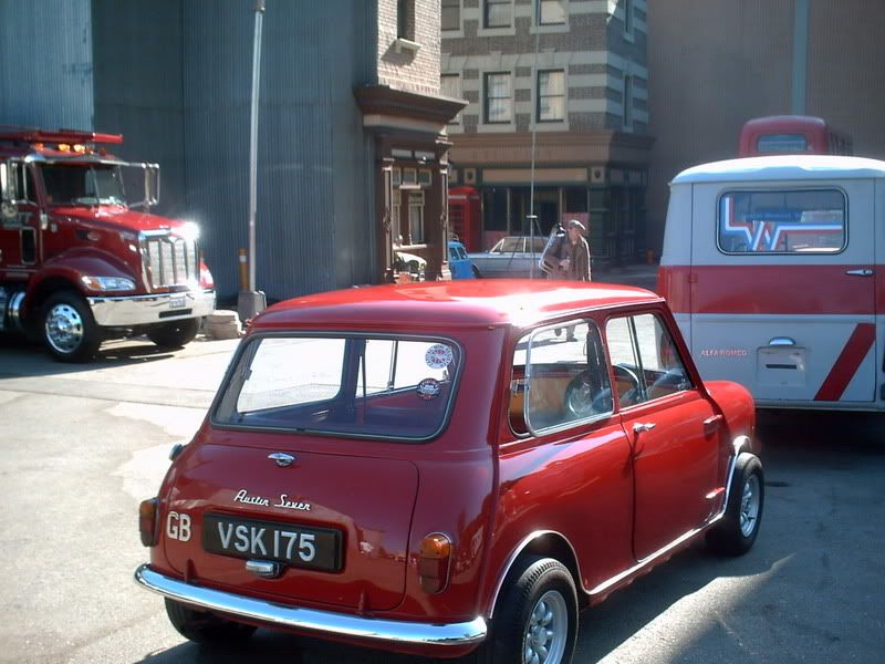 Hi everyone. I figured I would post up a few pics from a recent job I did. My Mini and I were hired as actors in a movie that is currently in production at the Universal Studios Back lot in Hollywood. The movie takes place in the early 70's in London. So they transformed the 'New York Street' section of the studio into London.