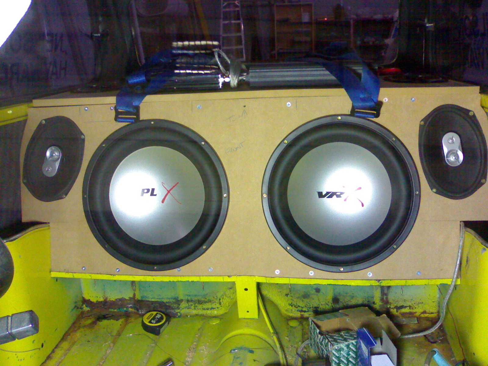 I wish I could attach them there, but I had to cut holes and feed them through to the rear seats. The spekaer box isn't a sealed unit, still to get round to doing that.