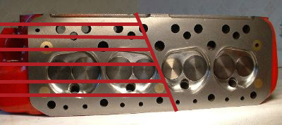 Ok lads I have an old race head which has been skimed to death and Im going to put it in my bandsaw this afternoon. Below is a pic I robbed from Phil and on it I have marked how I will be cuting one half up. Im happey to cut the other half up in anyway people would like.