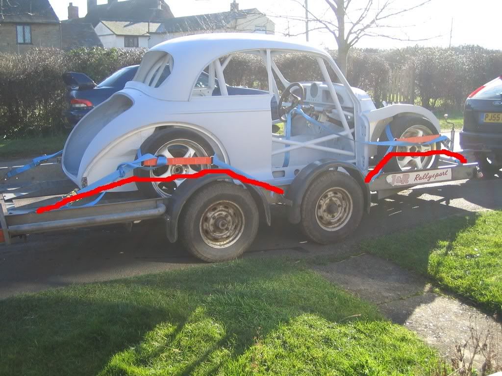 straps like that should be just below the centre line of the wheels, the straps will slip over the top of the tires when fitted like that with somthing as small as a bump or pothole let alone a shunt, if fitted under the centre line the the straps cant slip or come off in a shunt