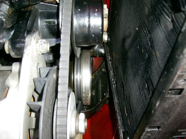 I have done this, but I never had to remove much down by the bolt as you seem to have. I notched round the trigger wheel center, cut the top face where the rad bracket bolts so it was parallel with the wheel, and then smoothed in the front verticle edge just enough to get the belt down past. From mmory, nothing needs removing from the bottom bit of the verticle face down near the top bolt hole.