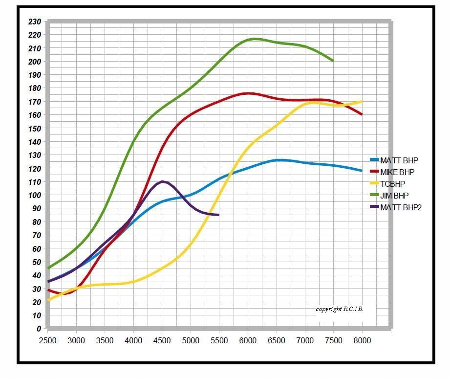 I was on an old Bosch dyno to optimize ignition....it made 225hp at the crank at 1 bar boost at 7800rpm (LT inlet, RS exhaust cam), the max I ran on the street was 1,2 bar. The compressor map of the GT 2056 is very broad and effective - I took the CHRA and turbine from a Mercedes (V-band) and fitted the bigger 56 compressor from another turbo....IIRR it was from an Alfa, but no sure anymore? If I could join the RR sessions in England easily I would run for sure more boost... ![]() http://www.minifreunde.at/harry/links/turbo.htm Based on these numbers using a gt2056 I don't think I'd be far off 200bhp with a gt17 at 14psi. On 7th Oct, 2010 5haneJ said: