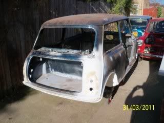 Due to lack of funds and space i am selling my project mini`s shell,it is completley bare.Has had lots of panels welded in a mixture of Heritage and patern parts including,A panels,inner wings,door post/steps,a floor panel,a rear wheel arch,heel board repair panels,mk1 light panels,flat boot floor,rear boot hinge panel,and full scuttle.I intended on the car being a track toy,so i removed the rear bins and rear seat section also the parcel shelf has had the holesaw treatment!Both doors have had new skins and the inners removed as i was going to use plastic windows.The lower dashrail has been removed and replaced with a piece of angle bar which the pedal box and steering colunm fits to.