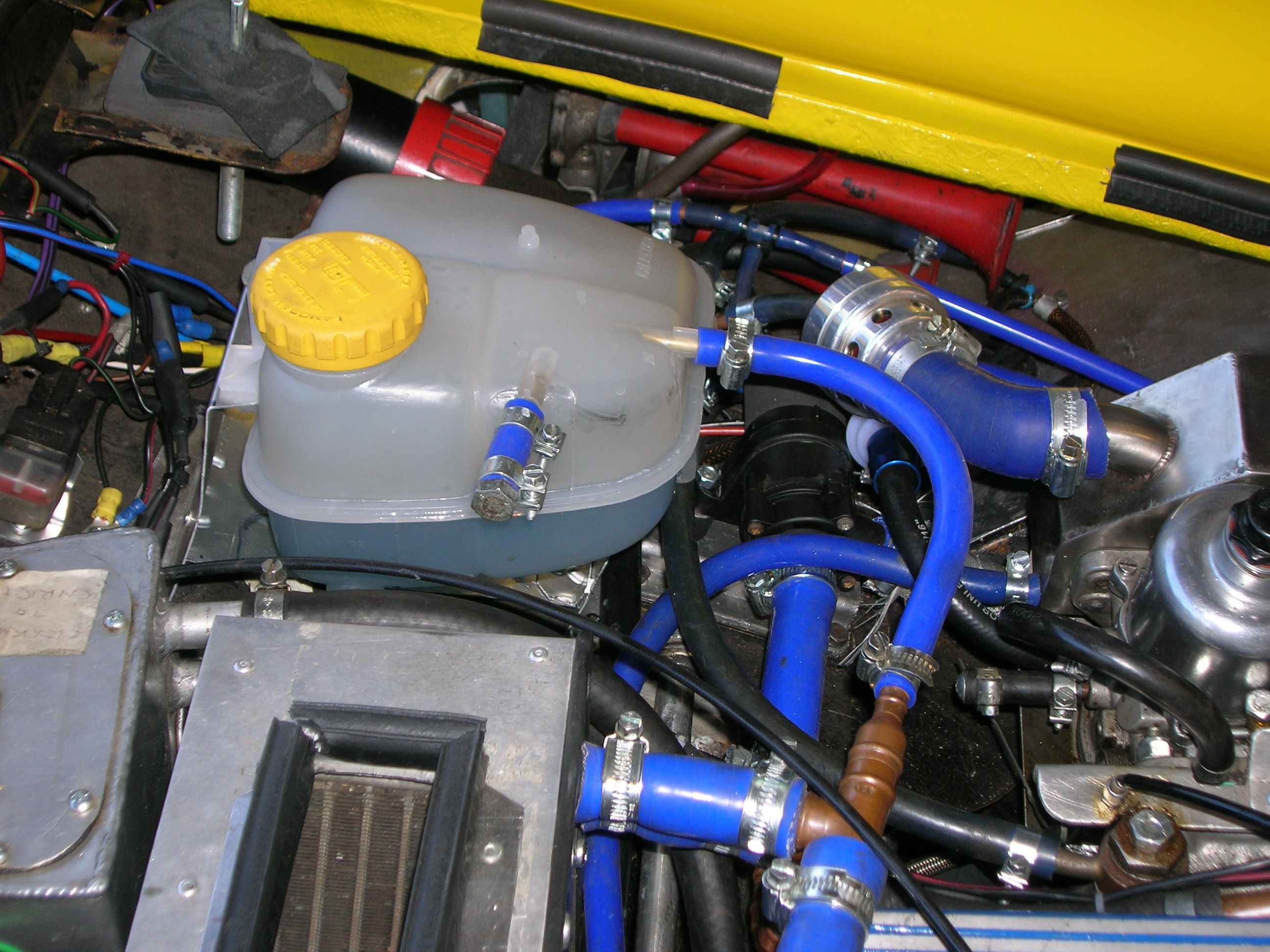 Bit of an update.Back together and retorqued head after 30 mins gentle running and 1 hour to let all the oil drain down.Most nuts moved about 1/8 turn up to 1/4 turn.Seems ok so far.Fitted an aux. water pump from a sprinter van between heater matrix out and turbo in.Also fitted it to a timer so I can run it on 10 mins after shut down.Tried this after a quick blast - the fan came on for a bit as usual,then the temp gauge climbed slowly until the fan came back on about 5 mins after shutdown,so seems to be working.Also modified the coolant cap with a weaker spring - now about 5-10 psi instead of 20. 'Where does the engine go?' |
