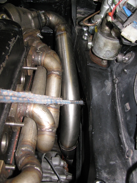 Just out of interest why did you go for 2 1/4" over 2" and where did you get the bends? If you can reduce the pressure downstream of the turbo, then it will help with cylinder scavenging and VE. Basically free horsepower. The bends came from ebay: http://www.ebay.co.uk/itm/80-Degrees-Exhau...h-/261075849700 That fits nicely through the gap. Saul Bellow - "A great deal of intelligence can be invested in ignorance when the need for illusion is deep."