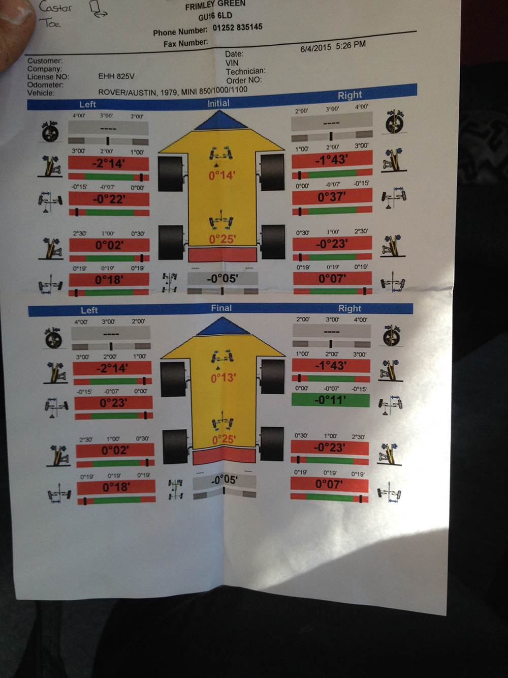 Just from a very quick look at the new photo of the previous alignment check it seems the castor was well out on the front left and never corrected.